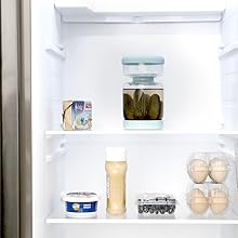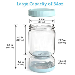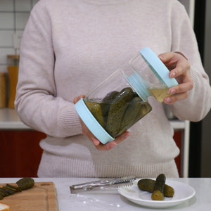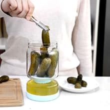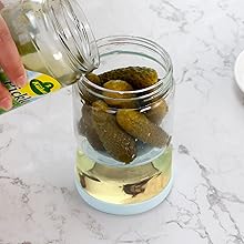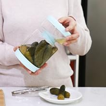 This pickle jar is 2-in-1 storage and serving solution. hourglass-shaped jar stores pickles and olive in their juices until you flip to strain for serving.1000ML Large Capacity.