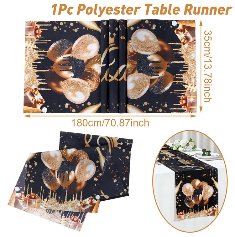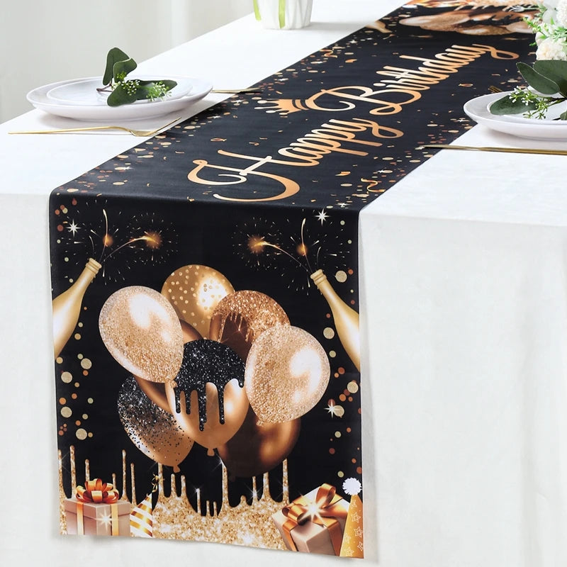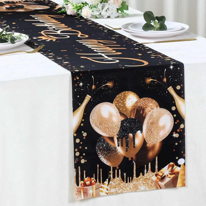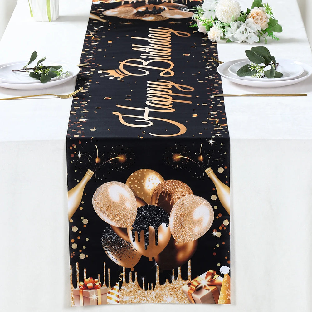 180x35cm Black Champagne Balloon Happy Birthday Table Runner HomeParty Decor Kids Adults Anniversary Birthday Party Supplies