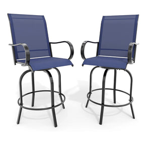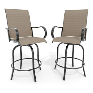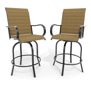 COMFORT TEXTILENE FABRIC - The outdoor swivel bar stools set of 2 feature excellent textilene mesh fabric. It is comfortable to sit on and fits your body line perfectly. You will like the touch and comfort it offers. The durable finish can withstand weather and UV rays. The curved arms and well ventilated seat won't make you feel achy or sweaty after long time sitting, making it suitable for year round use