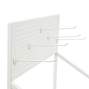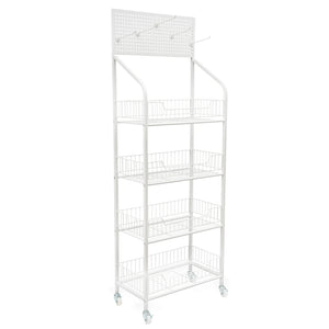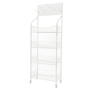 Spacious Storage Space: The 4-tier storage baskets allow for easy storage of various snacks, drinks, toys, and more. The top backboard with a perforated design and 5 movable hooks can hang kinds of hats and exquisite accessories.