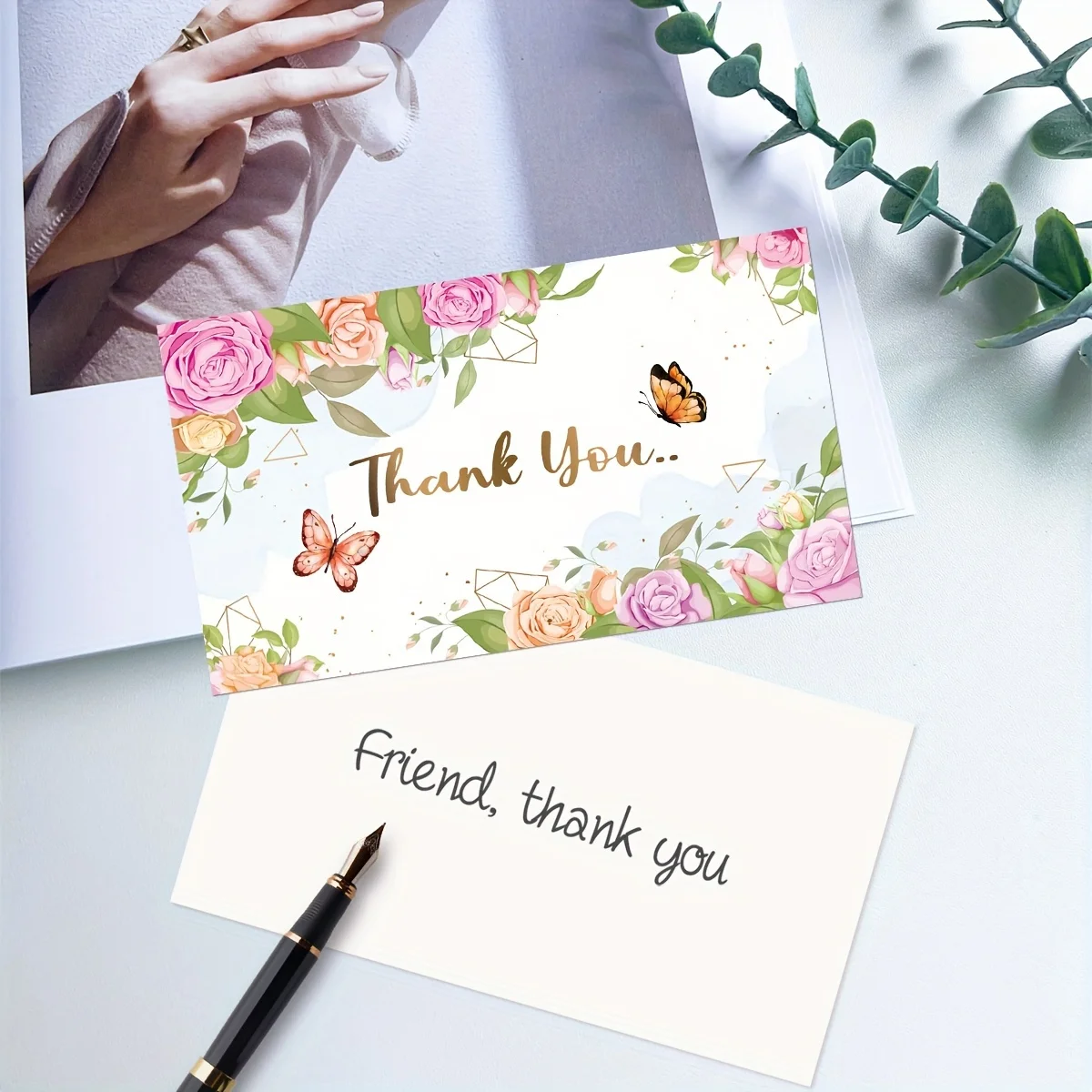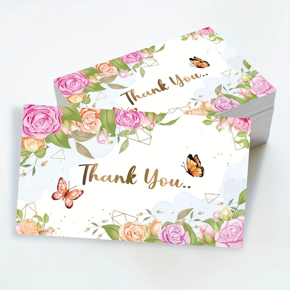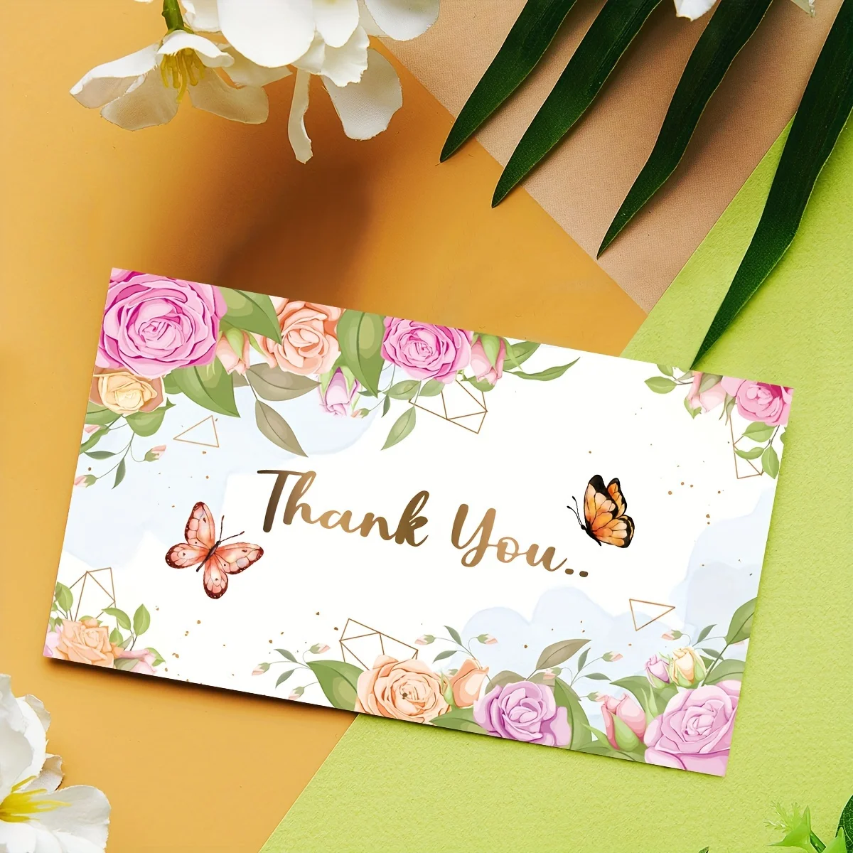 50PCS Elegant Floral Thank You Cards - Handwritten Style with Pink Roses and Butterflies, Paper Customer Thank You Cards