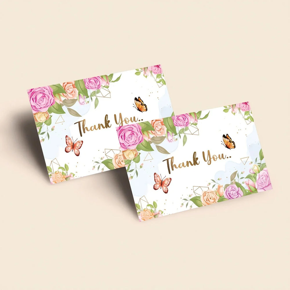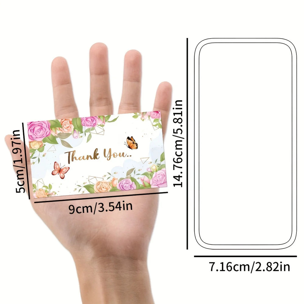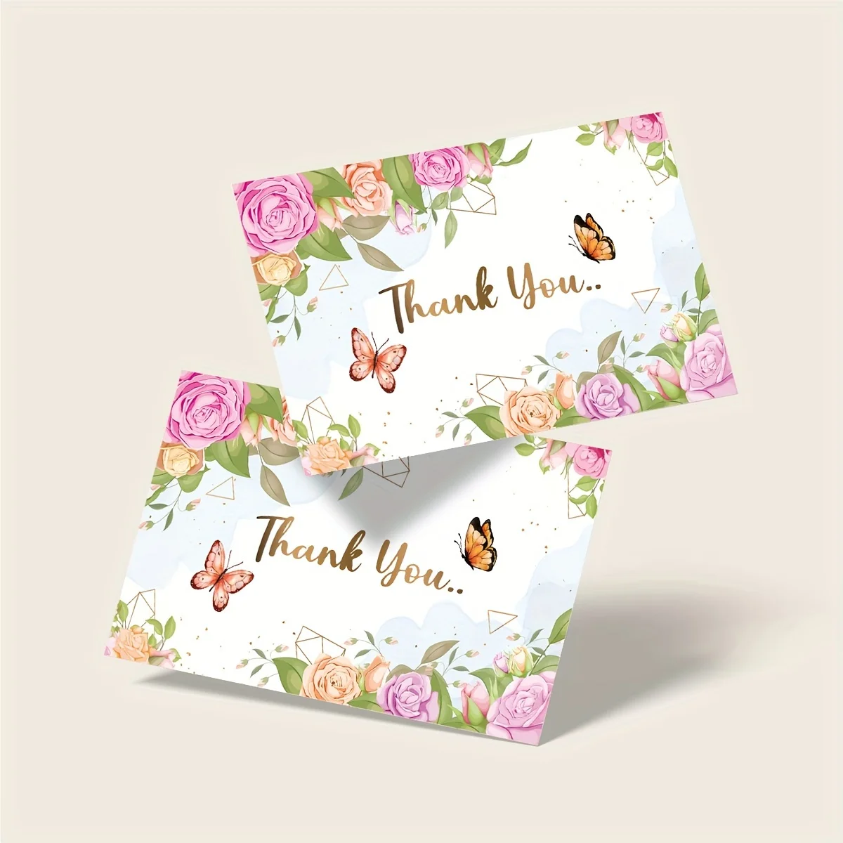 50PCS Elegant Floral Thank You Cards - Handwritten Style with Pink Roses and Butterflies, Paper Customer Thank You Cards