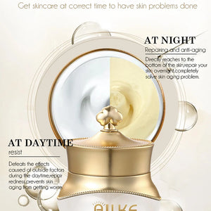 The cream can penetrate into the skin and nourish it at sleep, make the skin restore luster, eliminate and delay wrinkles. It nourishes and cares the skin and forms protective film to lock water. It can increase skin elasticity and transparency, making skin fresh and smooth.