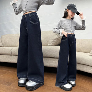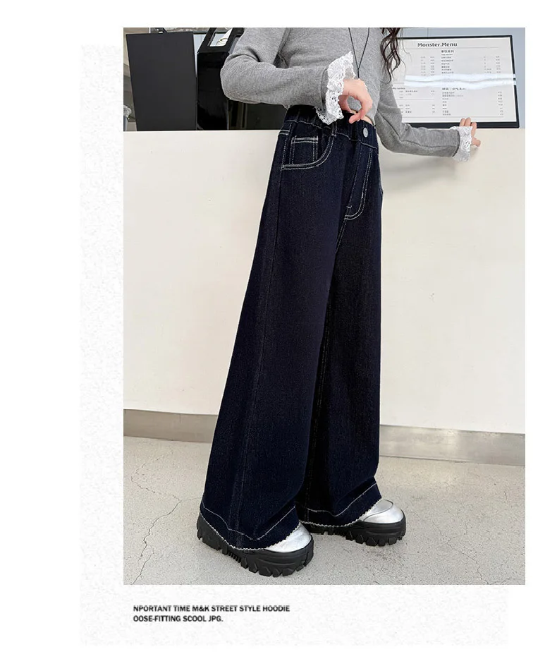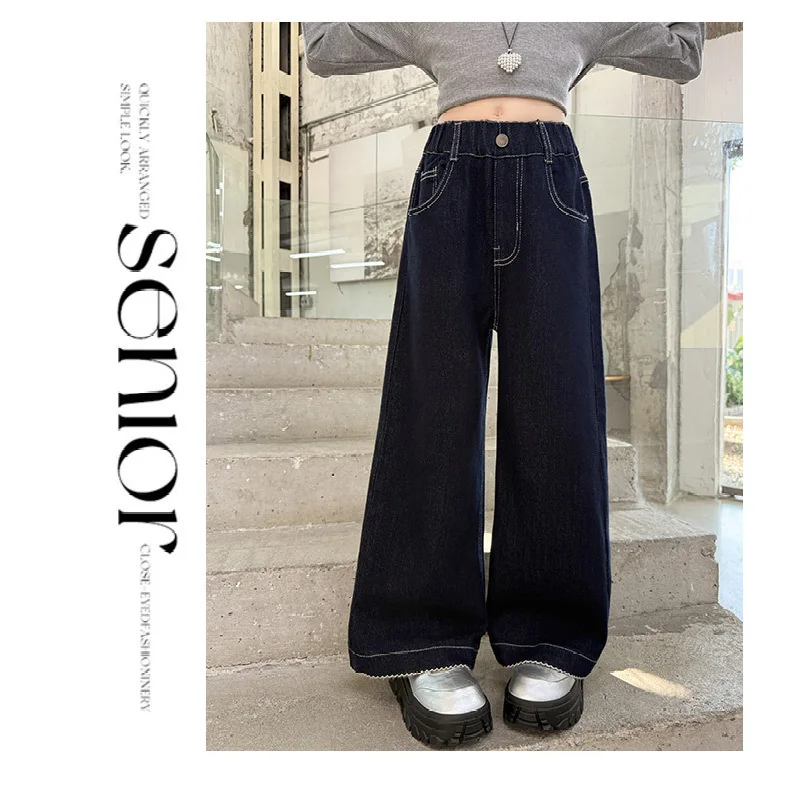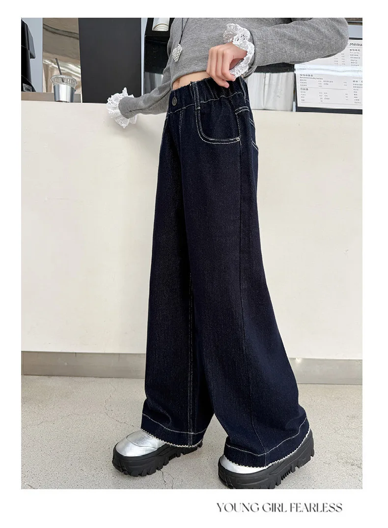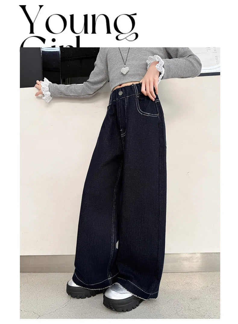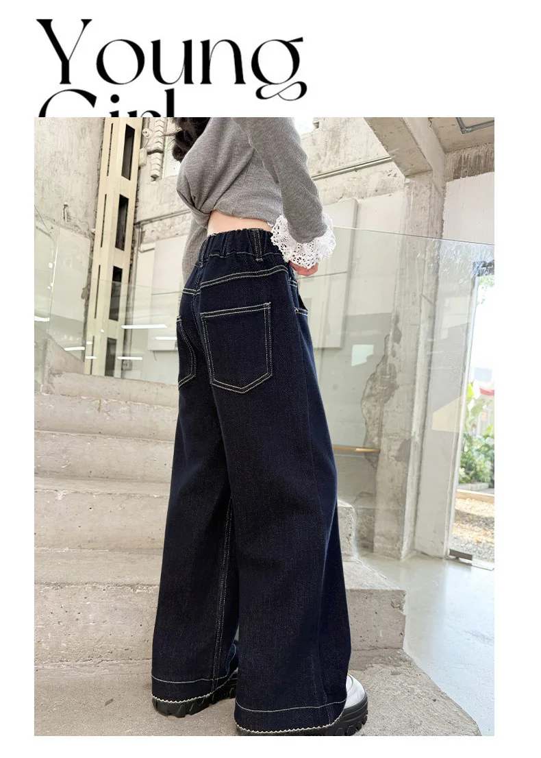Classic Design Kids Casual Wide Leg Dark Blue Washed Jeans for Teenage Girls School Denim Pants Child Solid Color Jeans Trousers