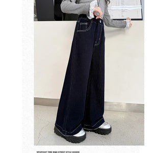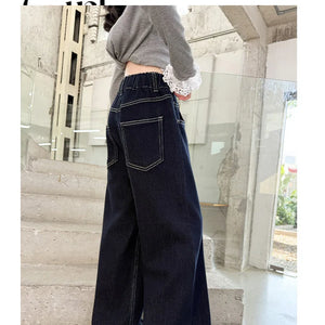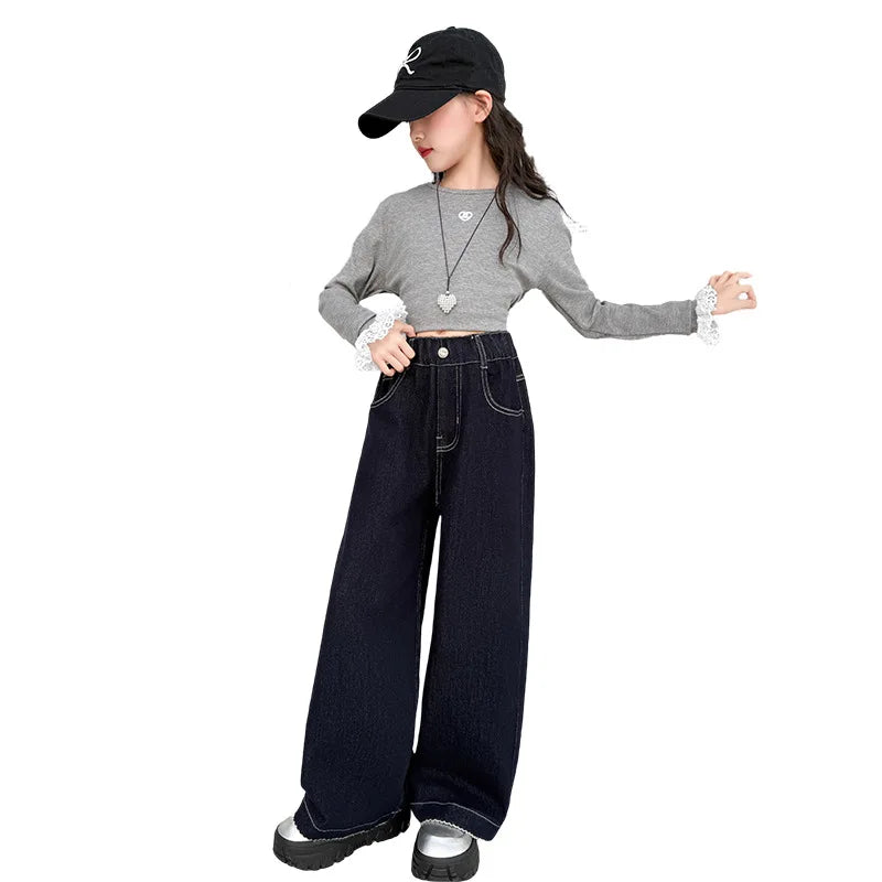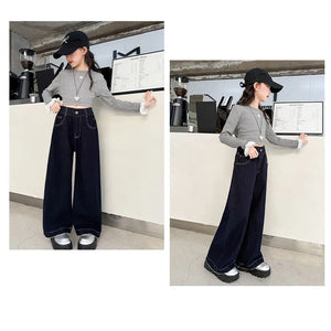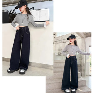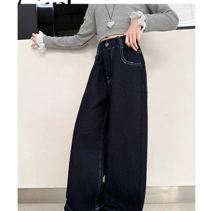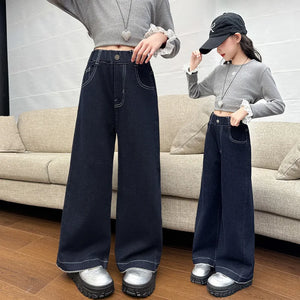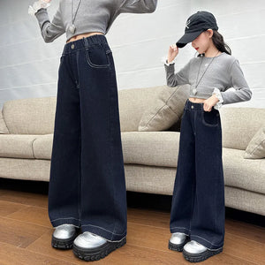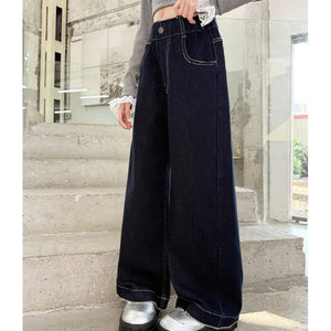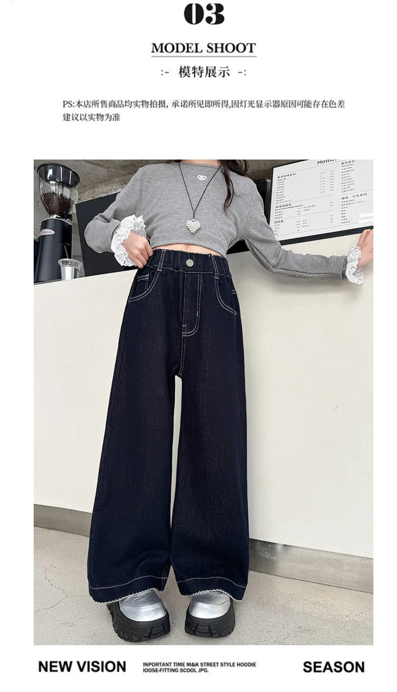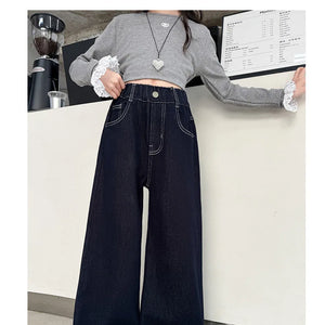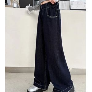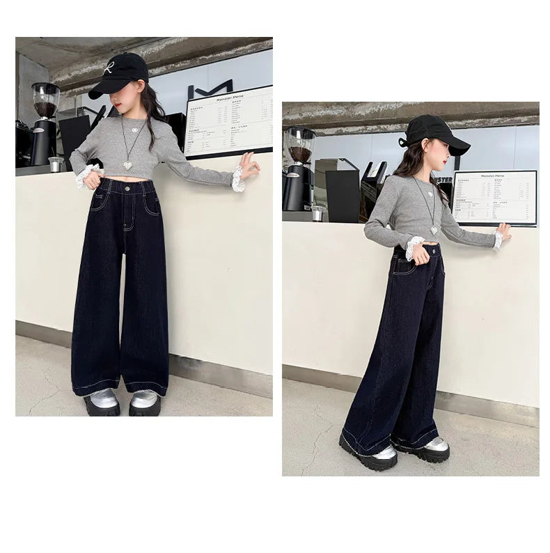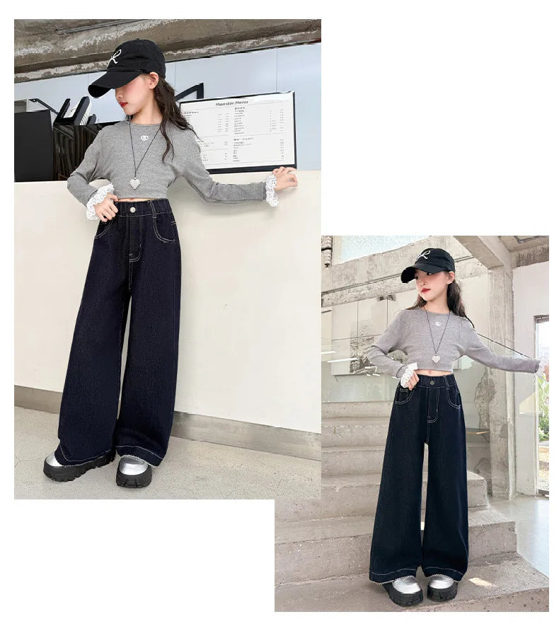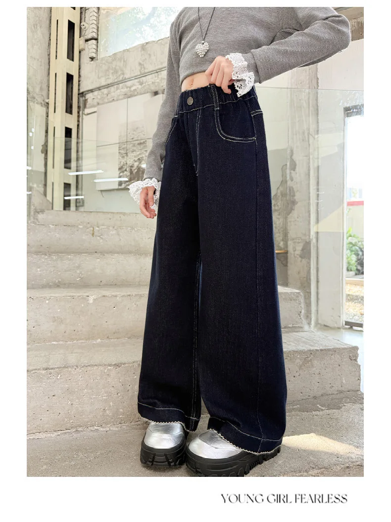 Classic Design Kids Casual Wide Leg Dark Blue Washed Jeans for Teenage Girls School Denim Pants Child Solid Color Jeans Trousers