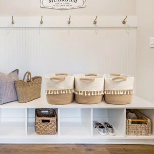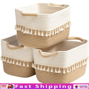 About this item Chic and practical storage: Our storage bins are stylish and functional to make your home effortless and elegant. Use storage basket in any room to store blankets, toys, magazines. The pet toys and small snacks also have their own place to go Solid and durable: Our boho storage baskets feature sturdy handles that make them easy to move around. Rope baskets stand the rigors of daily use. Thanks to a flexible and resilient cotton material, they can bounce back into shape after being folded Seven colors to choose from: These cotton rope storage baskets (15"x10"x9") are available in seven different colors: Jute, white, White&Jute, White&Gray, White&Pink, Stitches Rainbow and Black&Jute. So you can choose the color that best fits your decor Set of three: The boho baskets come in a set of three, giving you plenty of storage space while also saving you money. Use them all together to create a cohesive storage system, or spread them out throughout your home to maximize your storage space Thoughtful gift idea: Our woven storage basket are soft, flexible, and durable, with a unique tassel design that sets them apart from the rest. It’s a thoughtful gift for friends and family. The fabric storage are packaged nicely and ready to be gifted