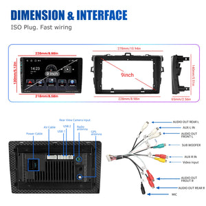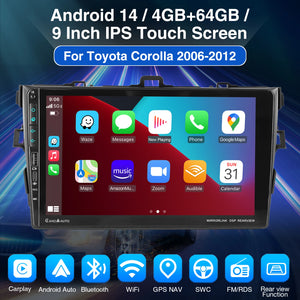 9 Inch Android 14 Car Radio for Toyota Corolla 2008-2013: The Android car radio with 9" 1280* 720 HD capacitive touchscreen, 2GB / 4GB RAM and 64GB ROM allows you to download your favorite apps and videos, so driving is no longer boring. No extra frame, no cable change, plug and play. It comes with Canbus and supports most original functions: Steering wheel control, reverse signals and reading original computer data, etc.