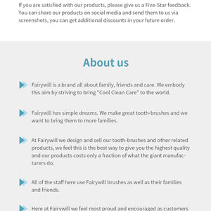 Fairywill is a brand all about family, friends and care. We see a world where the highest in stylish designs (Cool) meets the most effective cleaning (Clean) to bring the best oral care tools (Care).