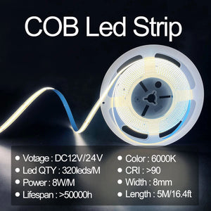 High Quality 5M Cob Led Strip Cri90 Free Cutting 12V 24V 3mm 5mm 8mm Self-adhesive Led Strip Light