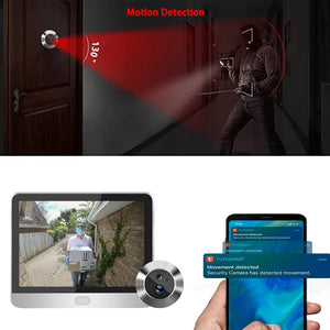 It has 130° wide angle,when somebody pass by your door(you can set the sensitivity in the setting to control the trigger distant) ,the camera will start recording 20 seconds video,and your phone will receive a notifiction.