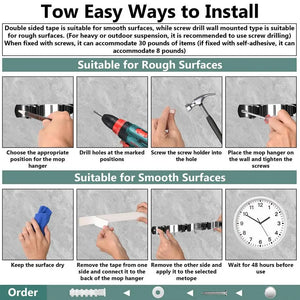5.Easy Installation: Our broom holder can securely hold up to 30 lbs with screws and 8 lbs with self-adhesive, making it suitable for heavier and lighter items. Its easy installation requires no drilling, allowing you to keep your tools and household items organized without any hassle.