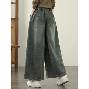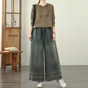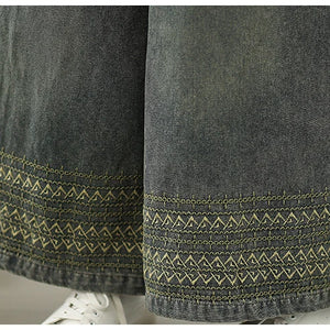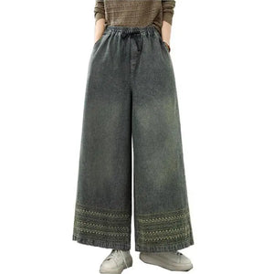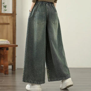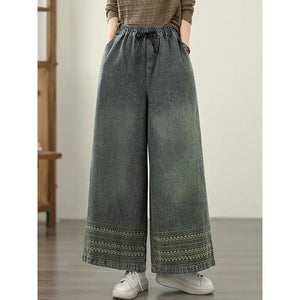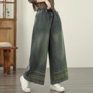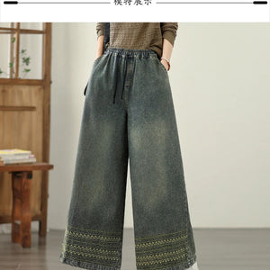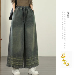 Jeans Women 2025 Autumn New Jeans Retro Heavy Industry Embroidery Ethnic Style Elastic Waist Casual Oversized Wide Leg Pants