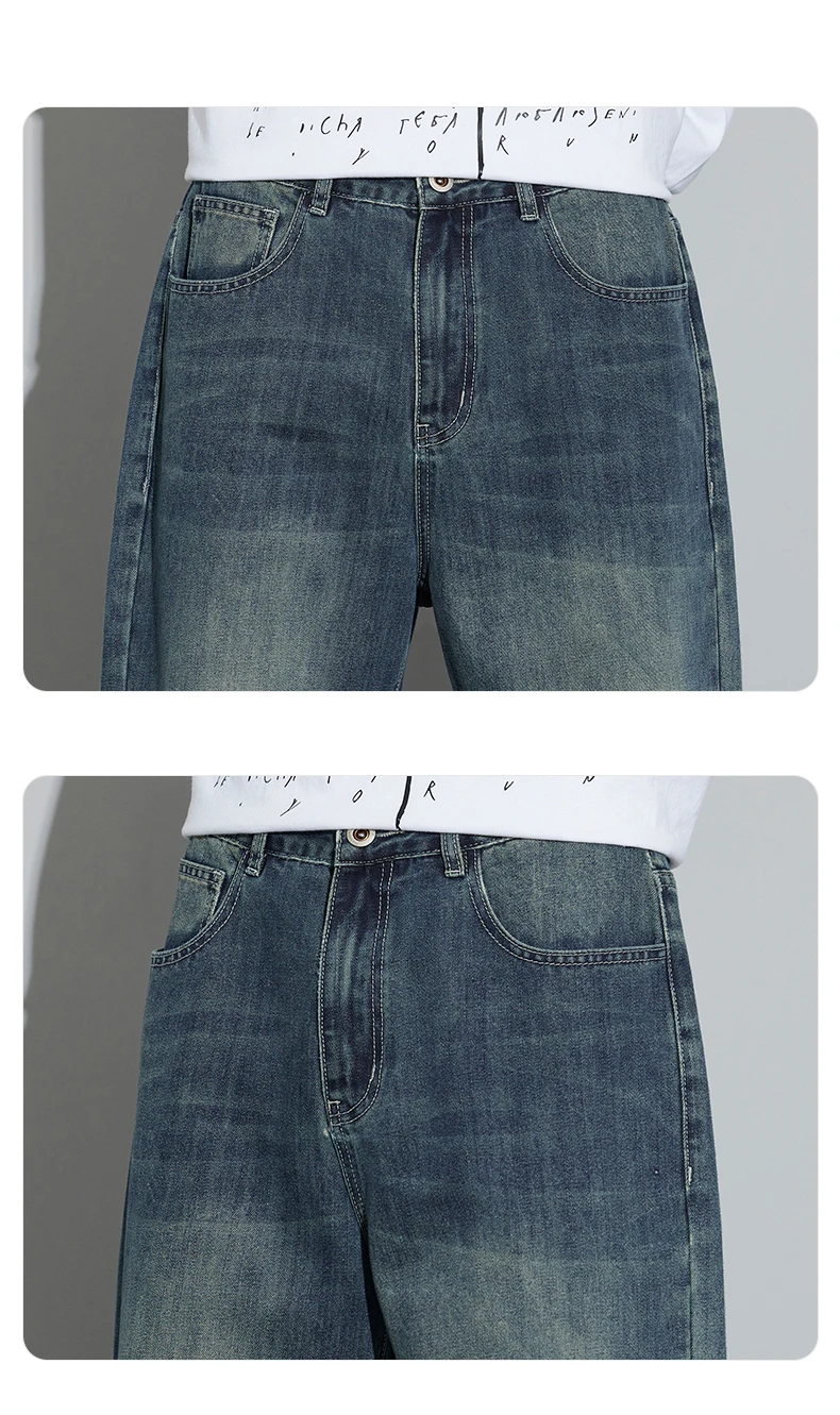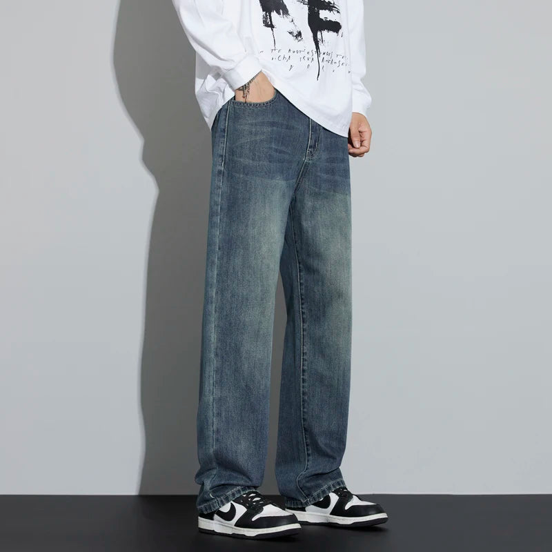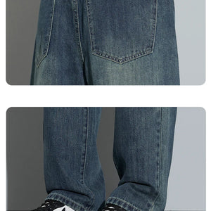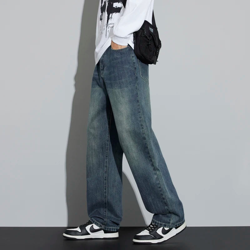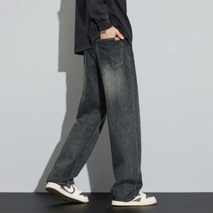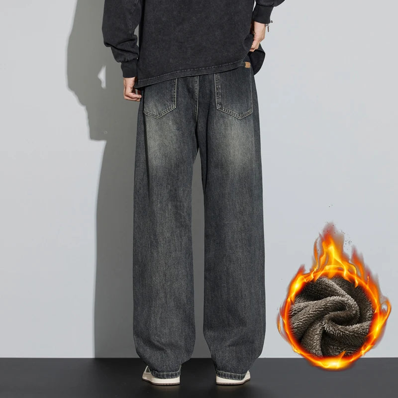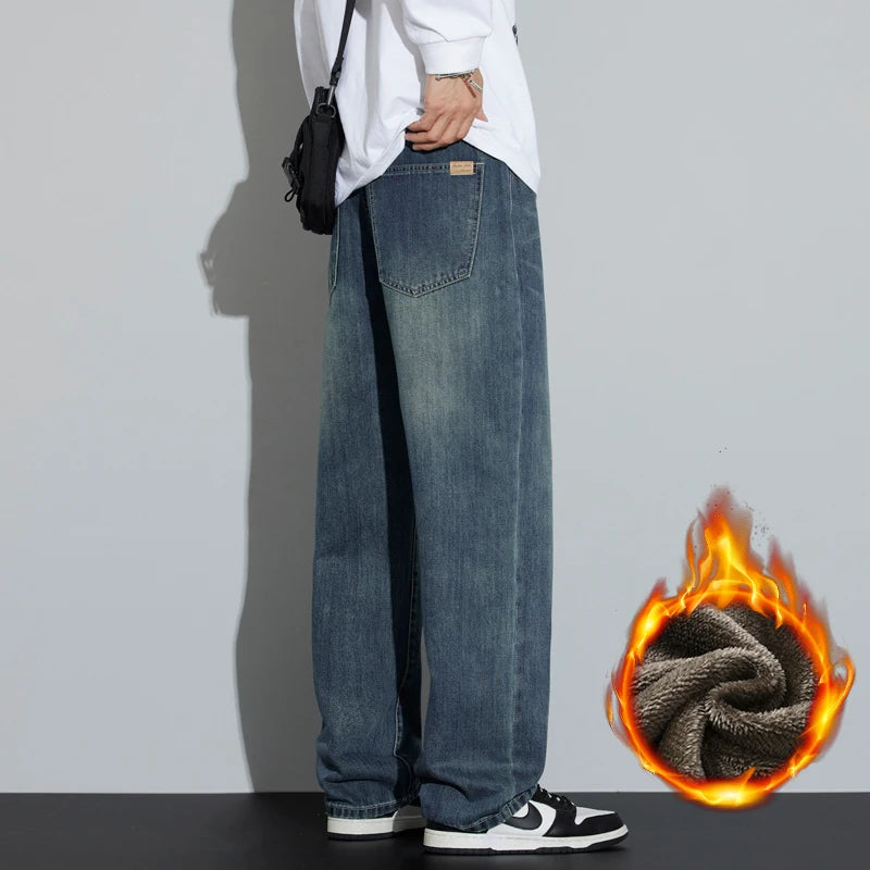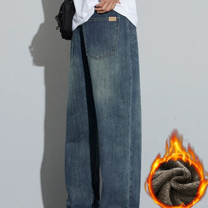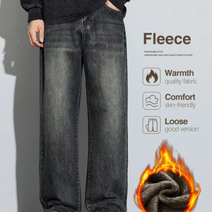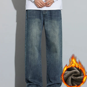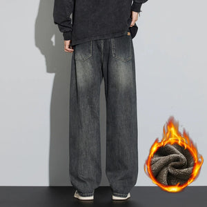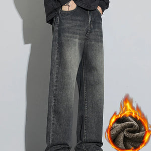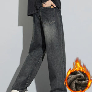 Korean Wide Legs Fleece Jeans Men's Winter Warm Thickened Velvet Loose Straight Casual Denim Pants Korean Fashion Trousers