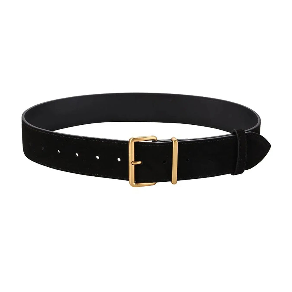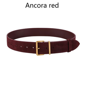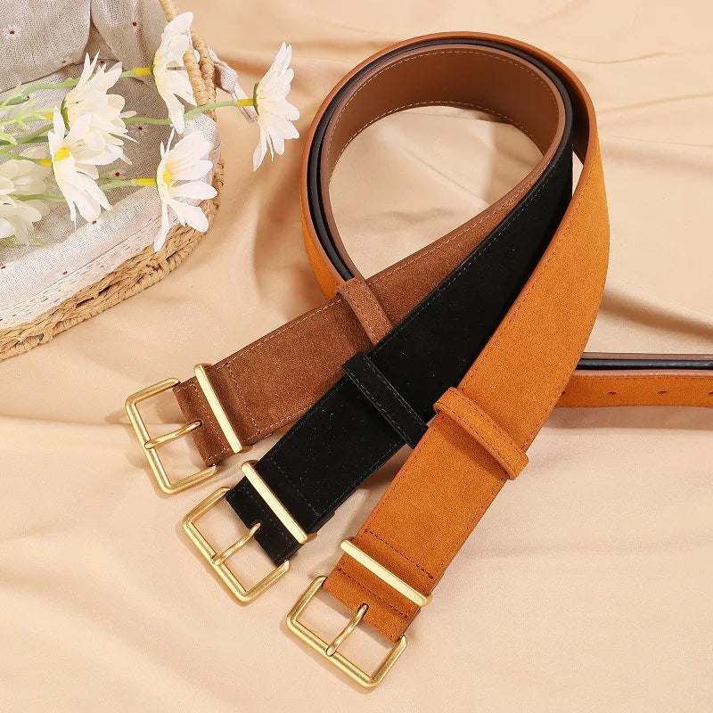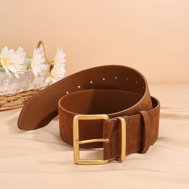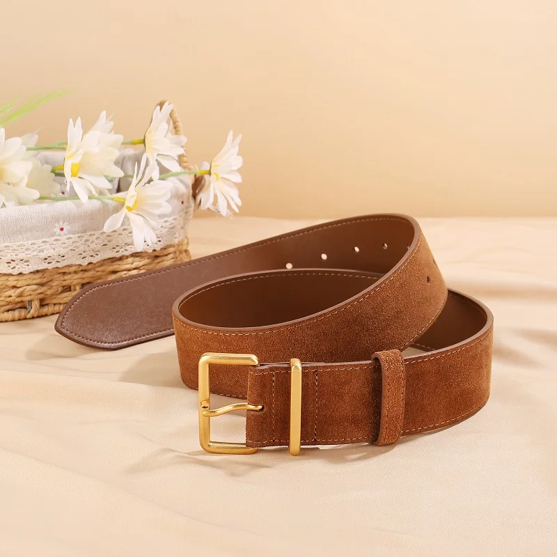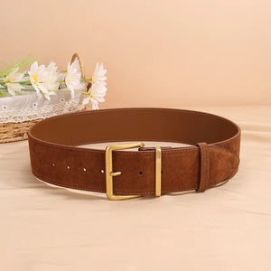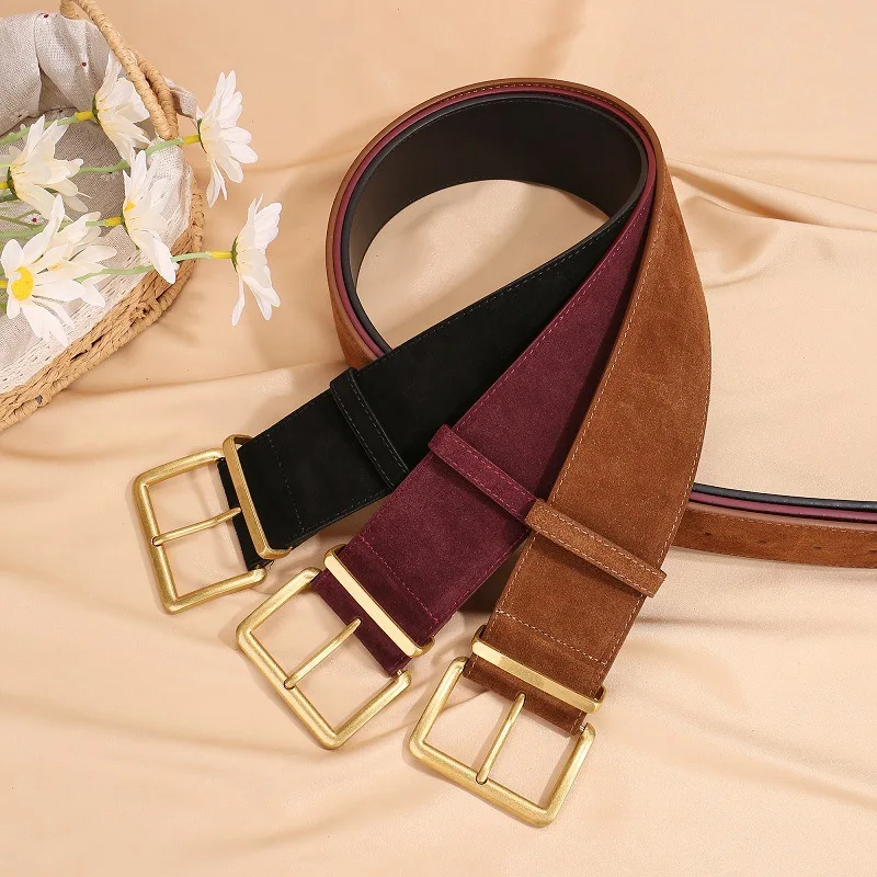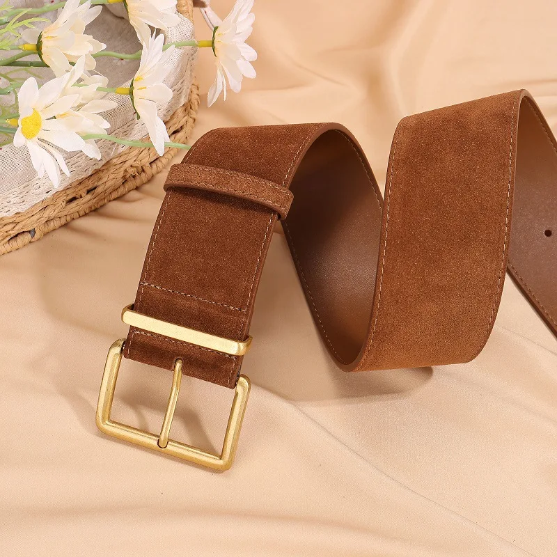 Ladies elegant suede cowhide belts retro style, with gold buckle 4.3cm wide belts suitable for matching dresses and jeans