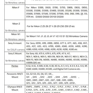 Applicable Camera Specifications: APS-C Mirrorless Camera,M4/3 Frame DSLR Camera,Full Frame Mirrorless Camera,Full Frame DSLR Camera,M4/3 Frame Mirrorless Camera,APS-C DSLR Camera