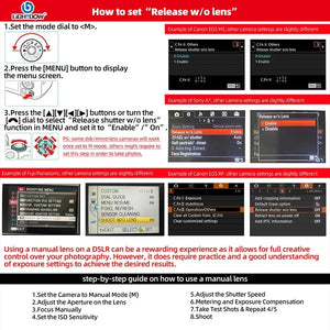 2.set the camera to M model because this is a manual lens,you have to adjust the aperture and focal length to make focus . Note:when put the lens to some Nikon cameras,it will appear:no lens attached ,then you just need to set the camera:Release Shutter without lens ,then you can use the lens to take pictures .