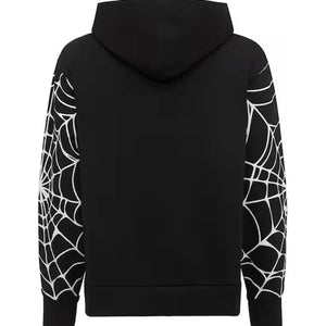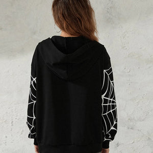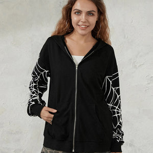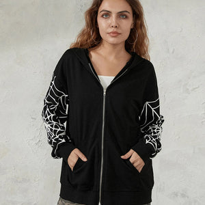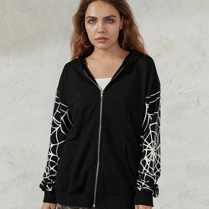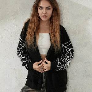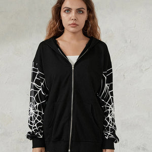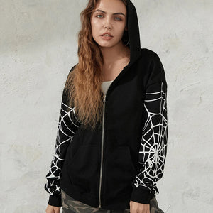 Men Women Zip Up Hoodies Fashion Spider Web Print Long Sleeve Oversized Sweatshirts Streetwear Tops