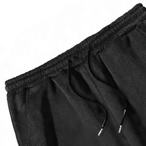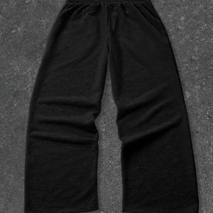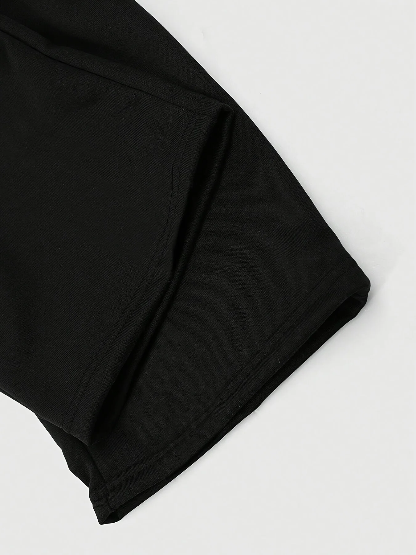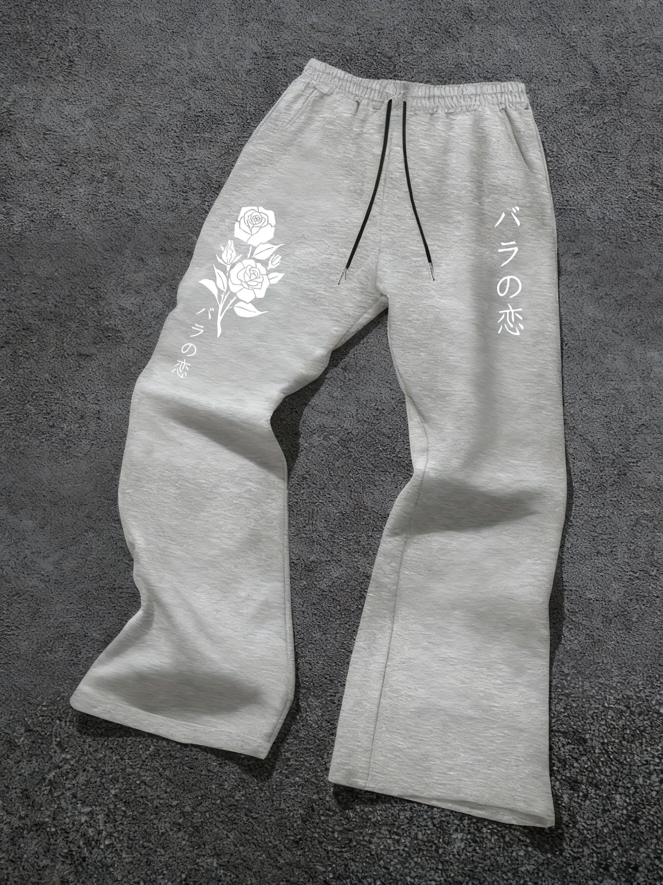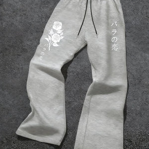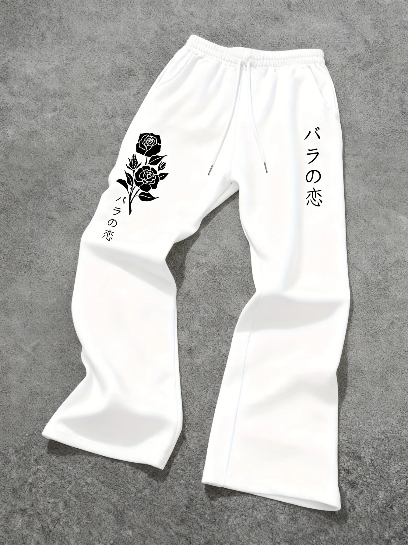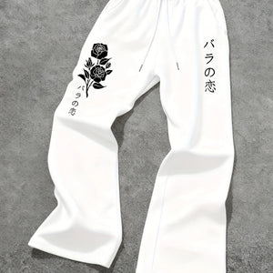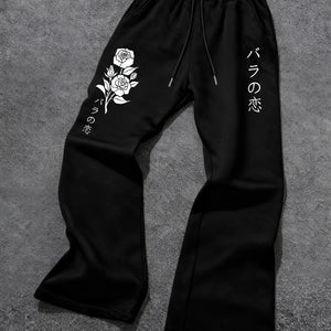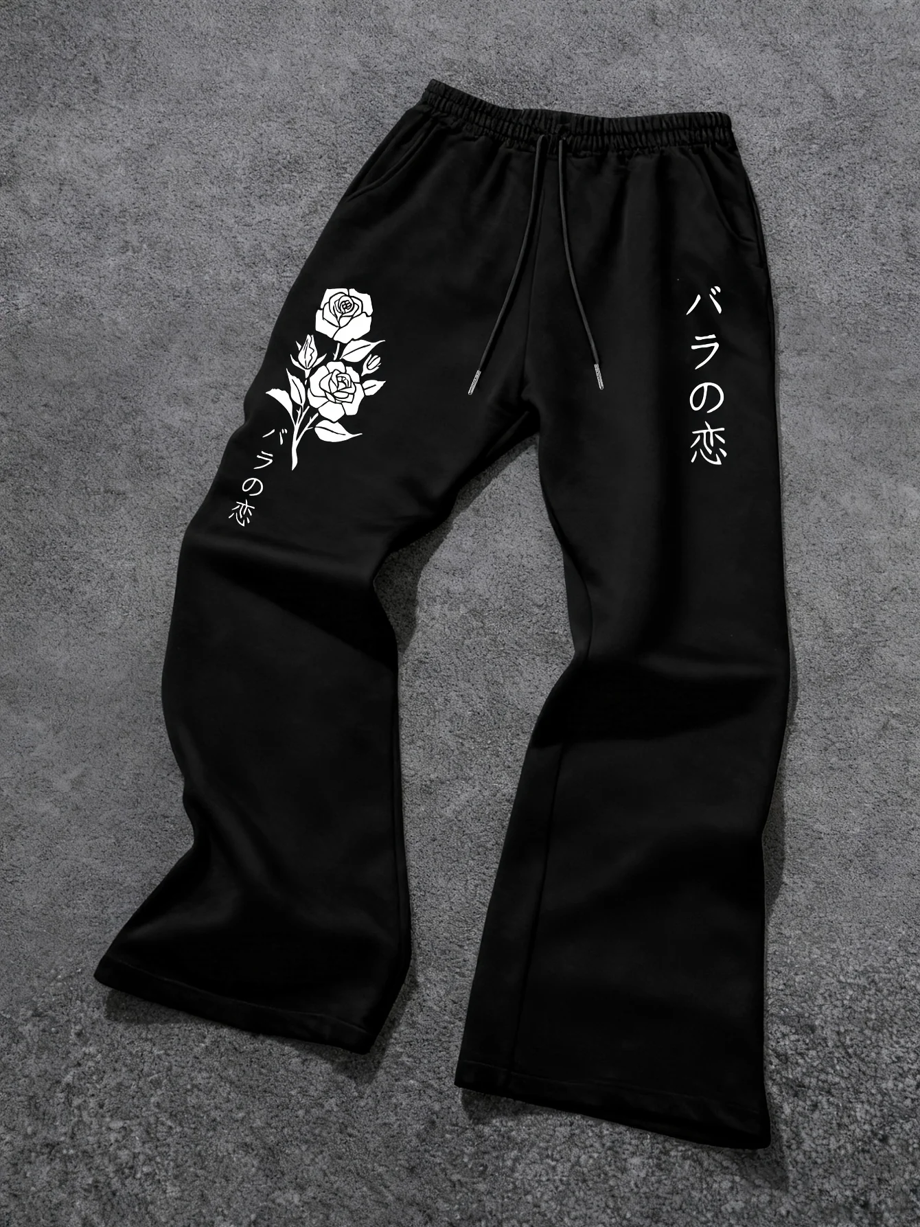 Men's black jogging pants with Japanese text and white floral print, simple street sweatpants, elastic waist casual pants 2025