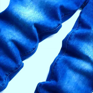 his pair of jeans adopts the exclusive sizing system of Europe and America. The high waistline and slightly loose straight cut perfectly fit the full buttocks and slender leg shape. The denim fabric undergoes nine water-washing processes, presenting a natural faded blue gradient texture. The deliberately retained cat whisker pleats at the knees add a retro touch. Wearing thick-soled boots instantly elongates the proportion. Pairing with a crop top can create a cool girl look for going out. Layering with an oversized suit instantly turns you into a trendy professional. This casual and free-spirited floor-length style perfectly conveys effortless elegance.