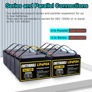 4 Pack 12V 100Ah LiFePO4 Battery Parallel=12V 400Ah