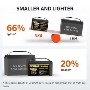 🔋 [Half the weight, twice the capacity] The 12.8V 100Ah LiFePO4 battery weighs just 24.25 pounds (11Kg), is half the weight and twice the capacity of a lead-acid battery, and you can easily move and install it. Our LiFePO4 batteries offer 100% usable capacity compared to lead-acid batteries,which offer only 60% to 70% usable capacity and can be tested with a percentage charge status meter.