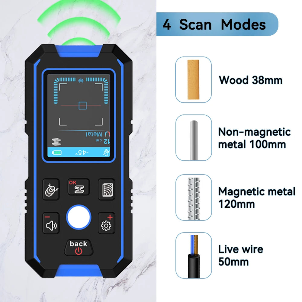 Depth measurement: Wood(3.8cm)/Live (AC) wire(5cm)/Non-magnetic metal(10cm)/Magnetic metal(12cm)