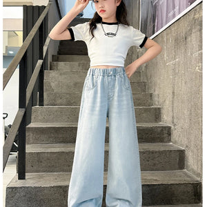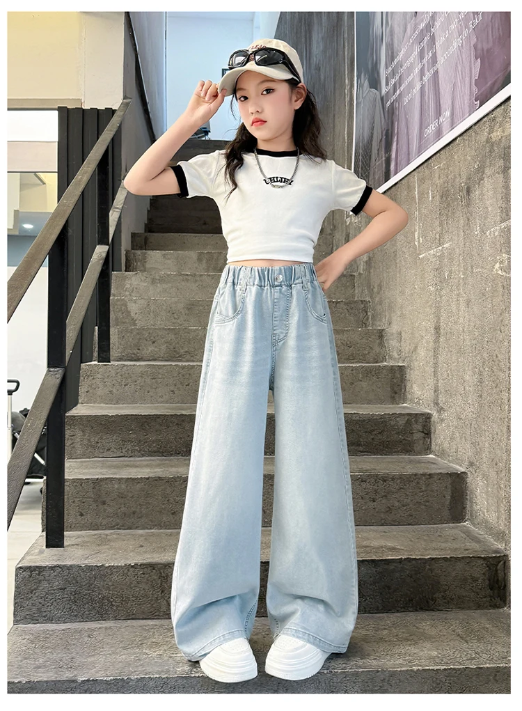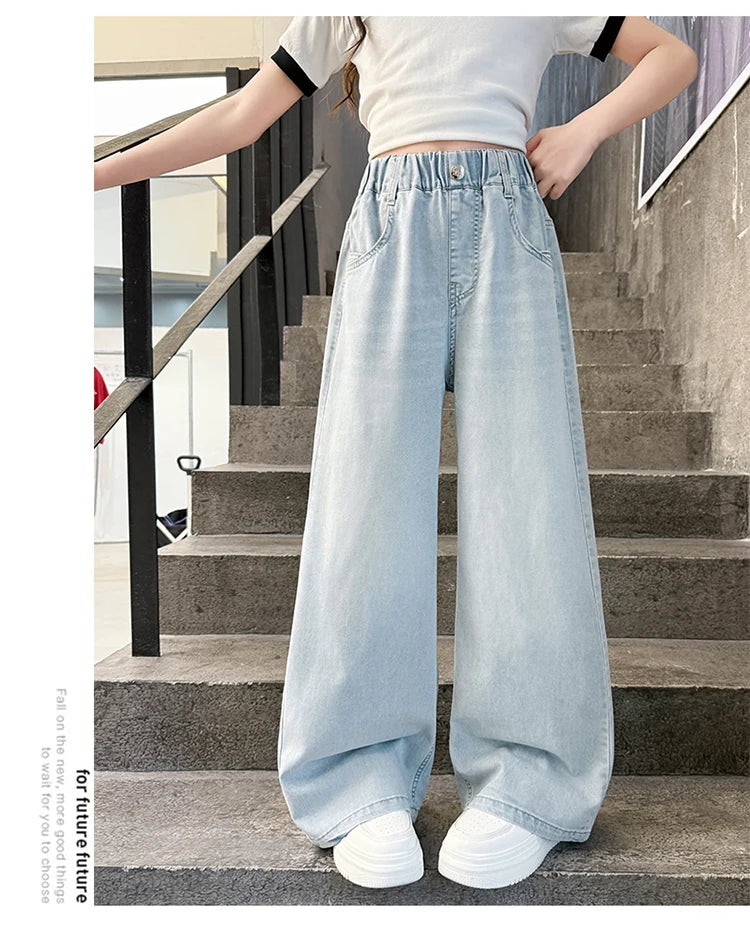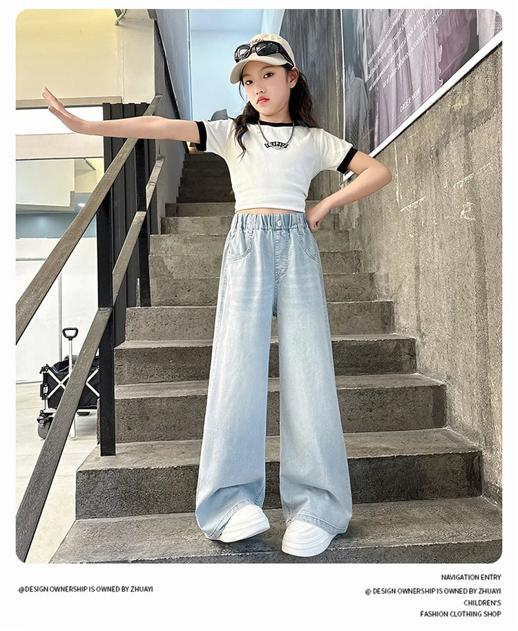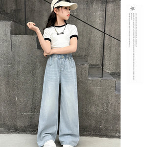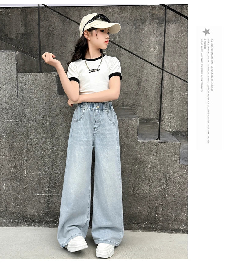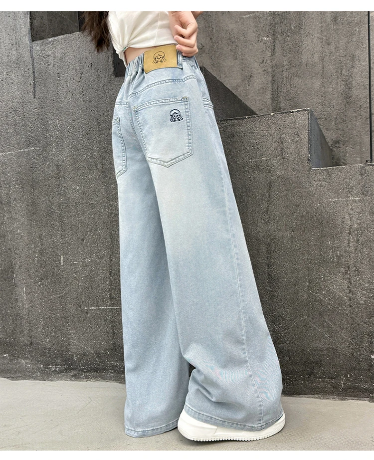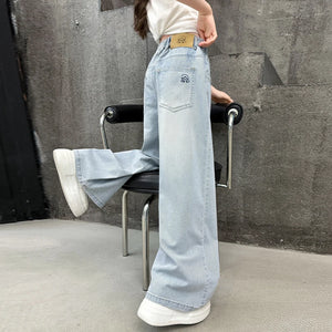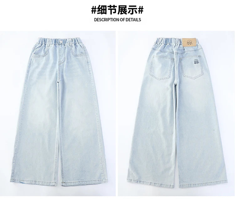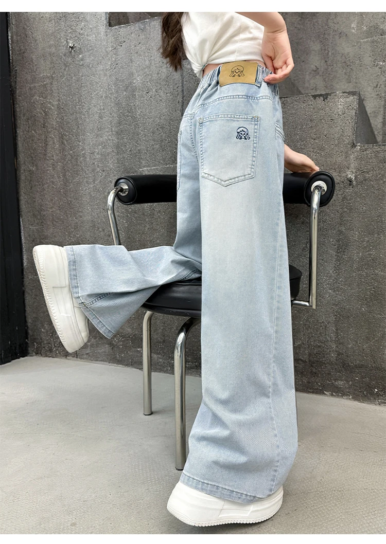 Spring and summer girls' jeans; cute girl's stylish loose straight-leg pants.