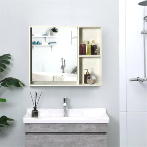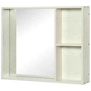 SPECIFICATIONSHign-concerned Chemical: NoneOrigin: Mainland China Features: - Wall-mounted design takes up little space - Mirror for better preparation for morning makeup or shaving - Ample storage shelves meet different requirements