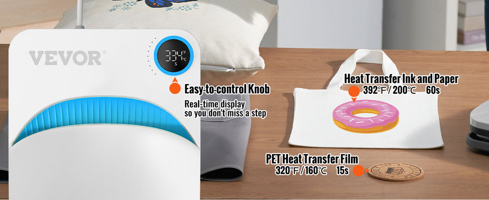 Small But Mighty: This power heat press from VEVOR is ready to create endless patterns on your t-shirts, canvas bags, coasters, pet collars, woodwork, baby blankets, etc. A thinner and lighter body reduces mass production fatigue and the burden of daily storage. Powerful things don't always have to be big.