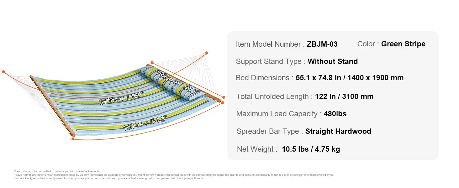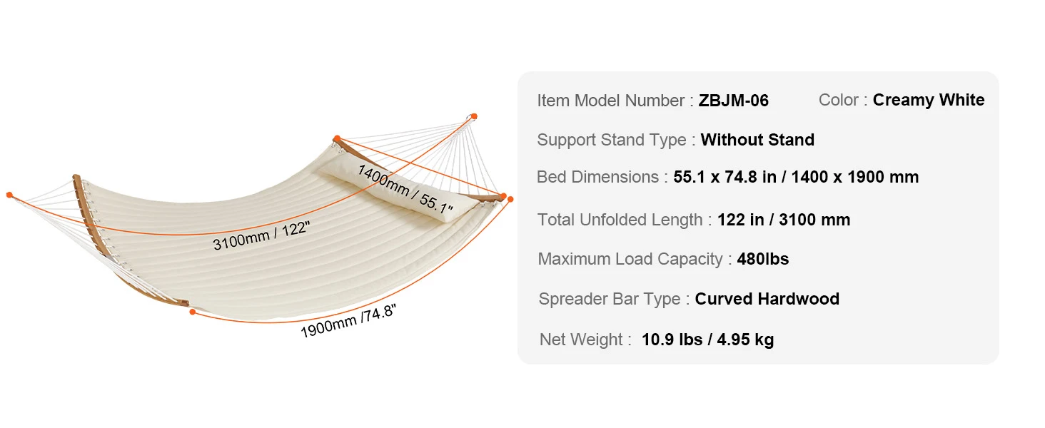 Quilted Hammock: Double hammock is made of high quality double-layered quilted polyester and cotton. We've upgraded the quilted cotton from 140g to 200g and reinforced the ends with tough stitching, ensuring it withstands outdoor use without tearing or fading.