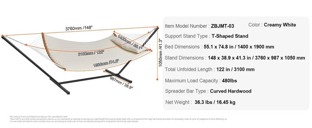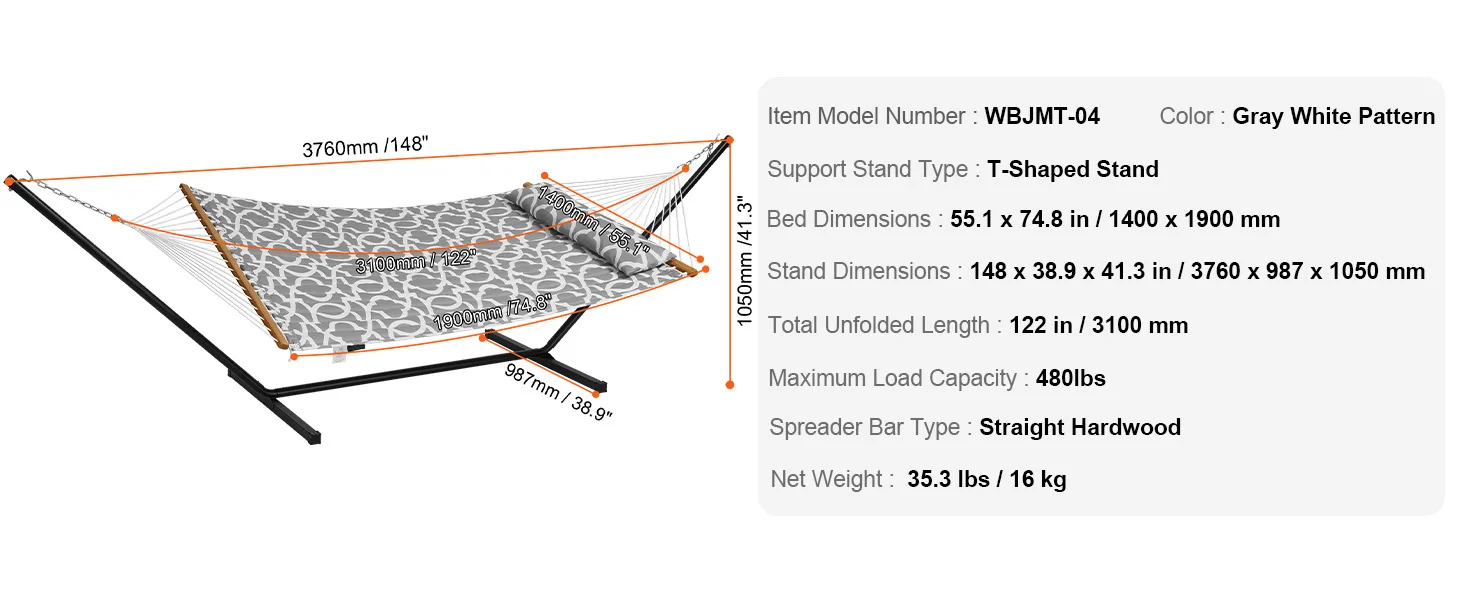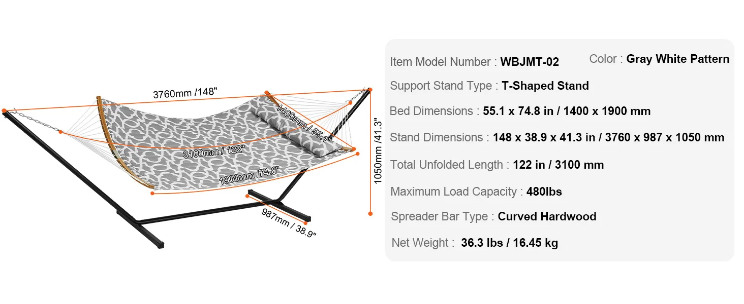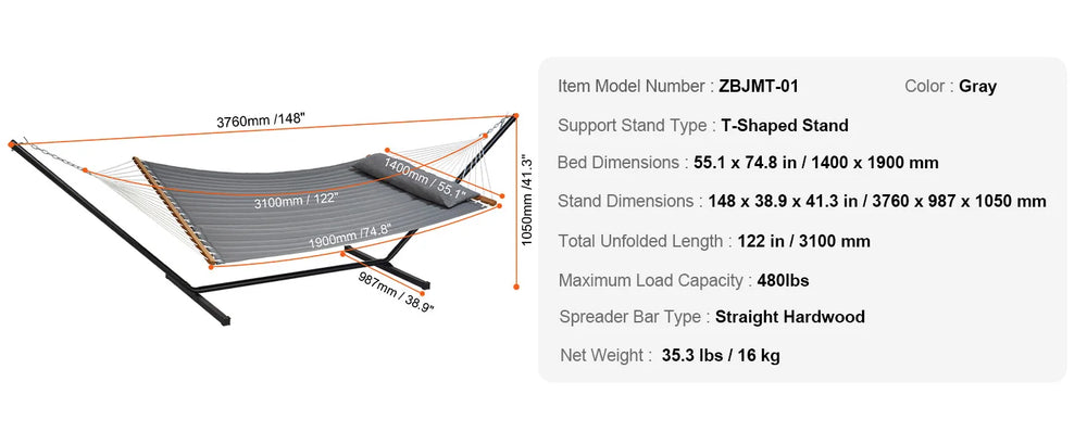Two-Person Hammock: With the addition of two 14" steel chains, it is large enough to accommodate 2 persons and the weight capacity is up to 480lb.