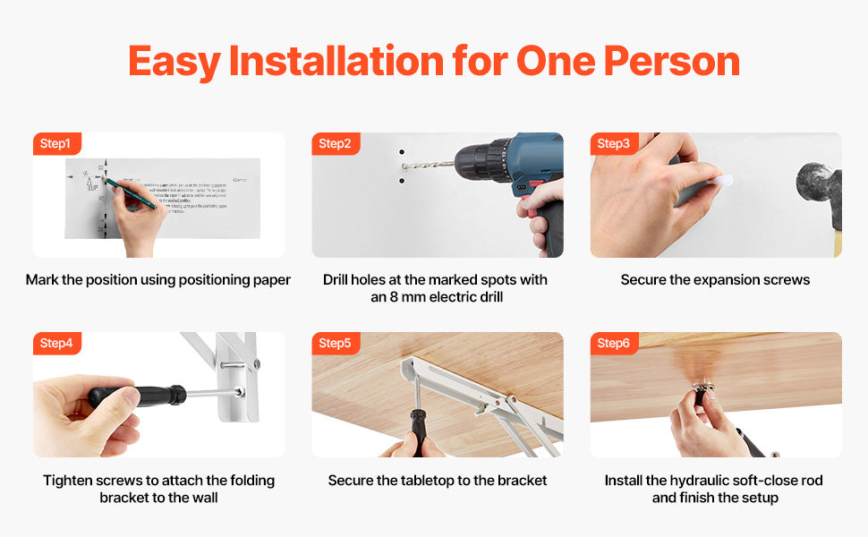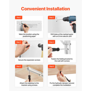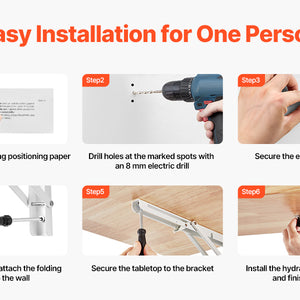 Easy Installation: Installing our wall mount folding table is a breeze with included installation positioning paper. Pre-marked installation positions on the template allow for quick hole drilling, ensuring a convenient installation process.