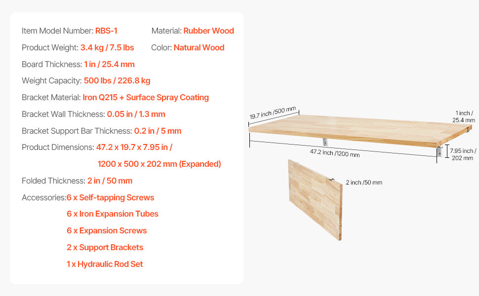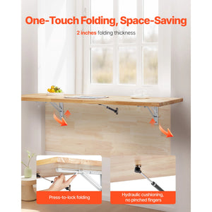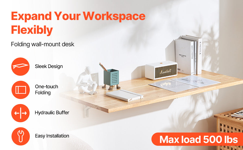 500 lbs High Load Capacity: Despite its compact size, this wall mounted desk holds up to 500 lbs thanks to its thick 1-inch material. It's stable for everything from small tools, large tools, laptops, and heavy books to decor items, ensuring everything stays steady. The slow-closing brackets prevent pinching during use.