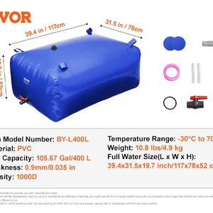 Manage water storage effortlessly with SucceBuy's 105.67-gallon collapsible water tank. Built from robust 1000D double-layer PVC, this tank ensures exceptional durability and leak-proof performance for safe and effective use. Ideal for outdoor adventures, home needs, garden irrigation, or emergency water supplies, this versatile solution is designed to handle a wide range of water storage demands with ease and efficiency.