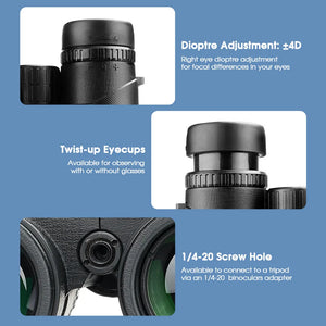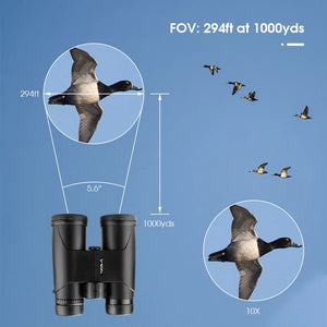 10X power magnification and large field of view: 294ft at 1000yds, specially designed for outdoor activities such as climbing, hiking, driving, watching wildlife and scenery. This power can also be used for watching large stage plays, vocal concerts, sports games, etc.