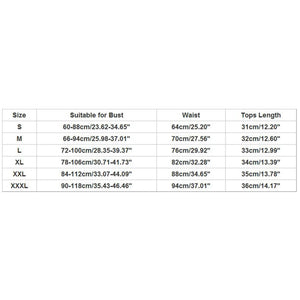 Size:S | Suitable for Bust:60-88cm/23.62-34.65'' | Waist:64cm/25.20'' | Tops Length:31cm/12.20'' |