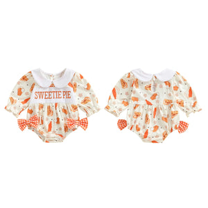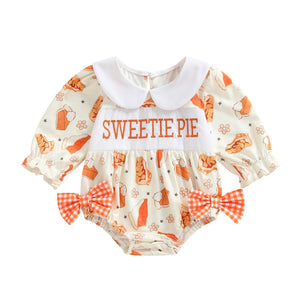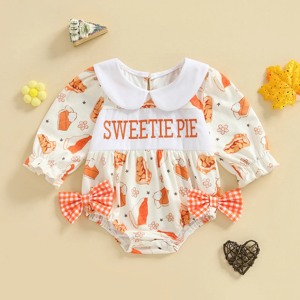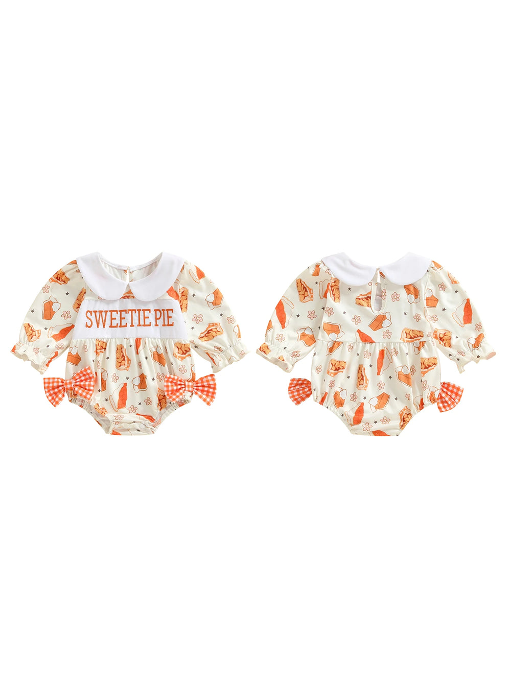 Baby Girl Thanksgiving Romper Cake Print Letter Embroidered Bows Doll Collar Long Sleeve Jumpsuit for FallSize (cm)