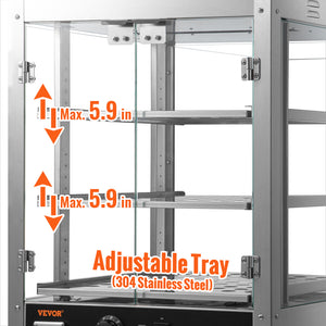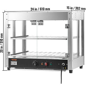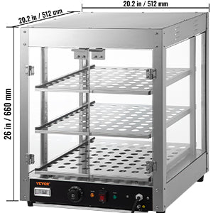 2/3-Tier Commercial Food Warmer: Overall Dimensions: 24 x 15 x 20in / 20.2" x 20.2" x 26". Our countertop food warmer has 3 spacious layers of interior adjustable food-grade shelves, allowing you to place different sizes of food at will. It is the perfect choice for canteens, bakeries, cafes, fast-food restaurants, and convenience stores. Ideal for holding and storing pizzas, tarts, fried chicken, or burgers, ensuring lasting freshness. Taste the difference with every use.