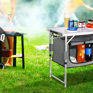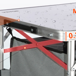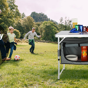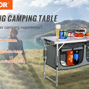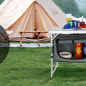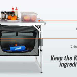 - Great Space Management: Our camping kitchen table is designed to take your kitchen outside! You can organize your food, stoves, grills, and cookware in an orderly manner on the tabletop, and zippered storage compartments.