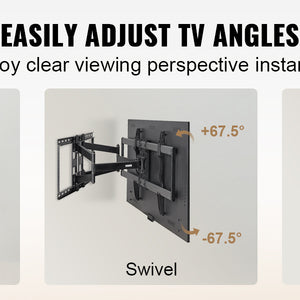 • Adjustable Angles: The full motion TV mount allows for easy angle adjustment. Tilt it up or down within a range of +5°/-15°, make horizontal adjustments of ±3°, and rotate it up to ±67.5° (rotation angle depends on TV size). Enjoy the perfect viewing angle for a clear and immersive experience.