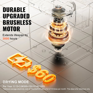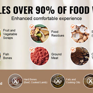 Long Lifespan & Intelligent Inverter: The built-in brushless motor lasts over 10,000 hours, far exceeding the 3,000-hour lifespan of brushed motors. It automatically adjusts torque based on waste hardness, increasing processing speed and saving energy. The turbo fan efficiently dissipates heat while maintaining low noise (≤45 db) for a quiet home environment.
