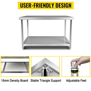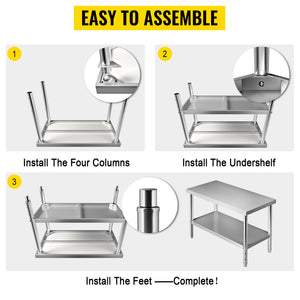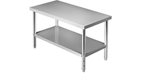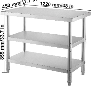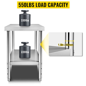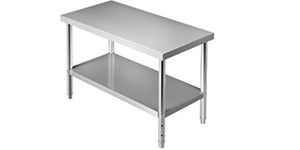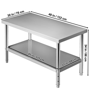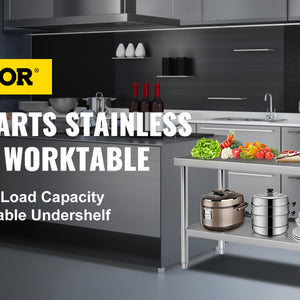 Heavy-Duty Work Table: Our stainless steel prep table has an undershelf for additional storage space. This stainless steel counter loads up to 396.8/550 lbs. It’s easy for you to store all of your most-used supplies.
