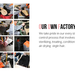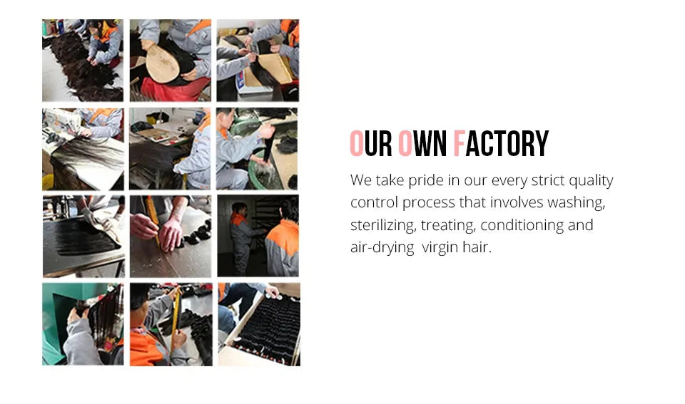We take pride in our every strict qualitycontrol process that involves washing.sterilizing, treating, conditioning andair-drying virgin hair.
