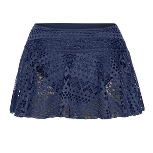 Skirted swim skirt with attached brief for a flattering fit. Crochet lace hollow out swimsuit tankini bottom swim skirt, lace crochet overlay design giving it a mysterious feminine vibe.