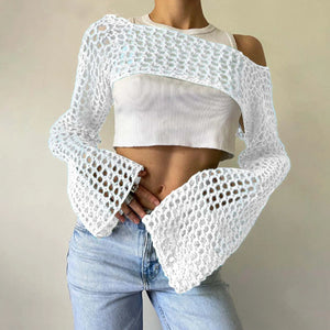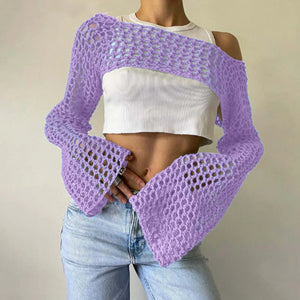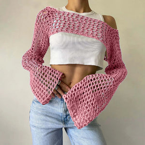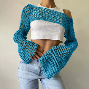 Womens Crochet Crop Tops Knit Sweater Hollow Out Long Sleeve Bikini See Through Cover Ups Coverup Bathing Suit Pareo